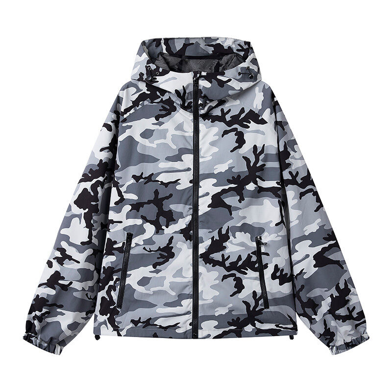This men's camo windbreaker jacket is designed for the outdoors with a water-resistant exterior, breathable mesh lining, and adjustable hood for comfort and protection. Featuring multiple pockets for storage, it's ideal for hiking, cycling, and casual wear.