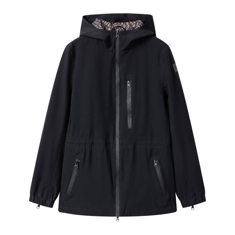 A sleek black hooded parka with a stylish printed lining. Lightweight, water-repellent and wind-resistant, designed for daily commuting and light outdoor use.