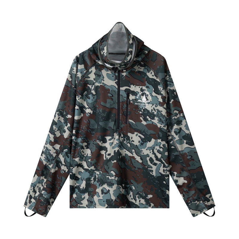 Built for outdoor movement and everyday streetwear, this half-zip camo hoodie combines a lightweight performance knit with a soft inner feel. The high-neck zip shields against wind, while the secure chest pocket keeps essentials close. Thumb-loop cuffs add comfort for layered wear in cooler weather.