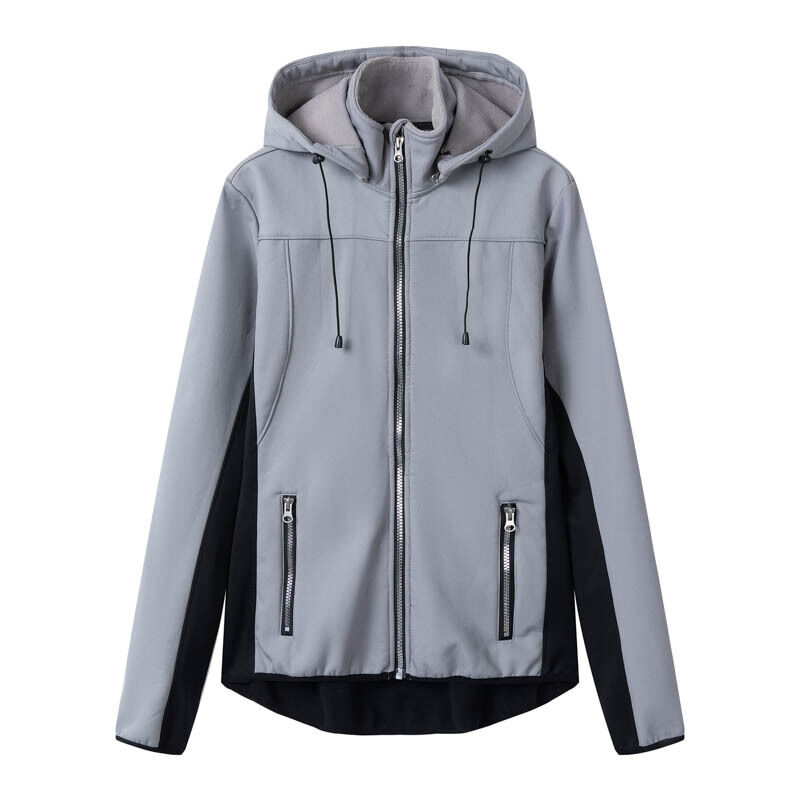 Designed for cool-weather versatility, this men’s colorblock softshell jacket pairs a smooth, wind-resistant outer layer with a cozy fleece-lined hood and inner collar. The full zip front makes layering effortless, while multiple zip pockets—including a rear pocket—keep essentials secure on the move. A clean gray-and-black panelled silhouette fits equally well for outdoor adventures and everyday city wear.